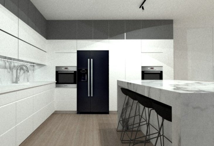In the tall wall cabinets, we positioned two ovens, each on its respective side of the kitchen, elevated to a convenient and accessible height, with two baking trays under each oven. Above the oven, we placed the microwave concealed behind an HK flap, preserving the kitchen's sleek appearance.