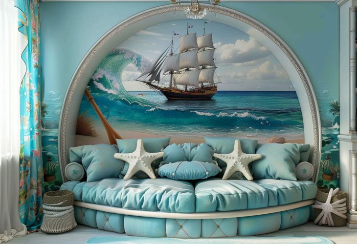 Display an oversized ocean photo above the sofa, and for extra flair, add a large ship picture accompanied by an antique ship's wheel on the wall.