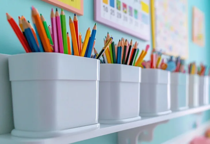 To create storage solutions, you can use cheap plastic boxes, wicker baskets, and even shoeboxes covered with sticker wallpaper. The sky's the limit when it comes to making storage containers. Shoeboxes and cardboard toilet paper rolls can definitely be used to store writing tools, papers, and small items. It's advisable to add labels to each box to keep things organized. To make the design aspect an enjoyable experience, dedicate a few hours to it. Sit with the children and let them decorate at least part of the containers themselves, making them feel like part of the process. You can opt for a uniform design line or try a free style where everyone creates according to their taste.
