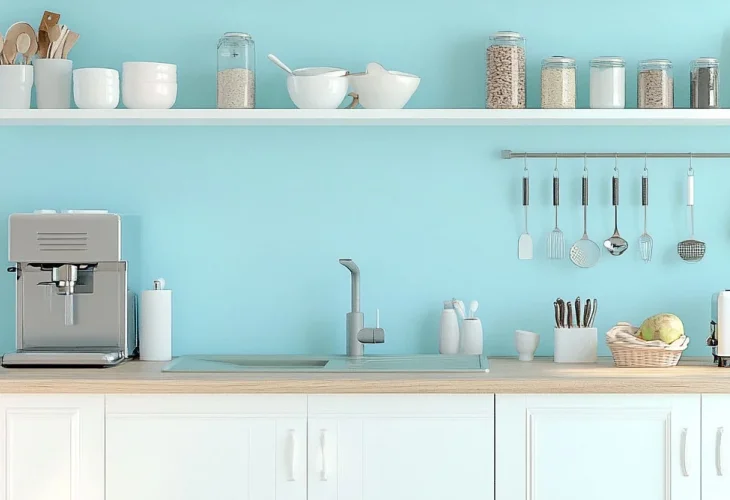 Utilizing corners is key in a small kitchen. Install shelves to use space efficiently, and add pull-out racks inside cabinets for easy access and to prevent clutter. Today, you can get pull-out shelves that require no drilling, just strong adhesive strips.
