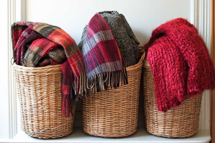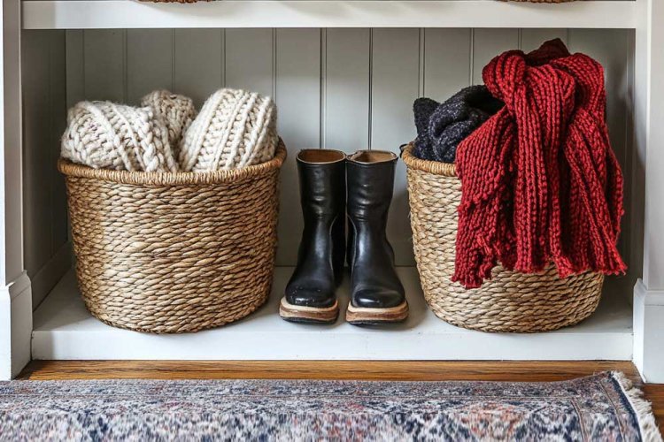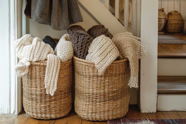 A simple and easy solution for storing winter accessories is using baskets. Purchase 2-3 large woven baskets and place them at the entrance of your home, or on shelves if there's room. Perfect for scarves, gloves, and even small children's coats.