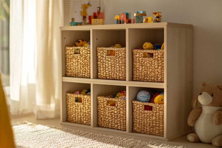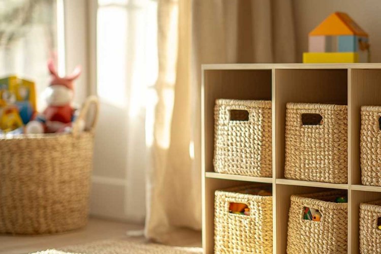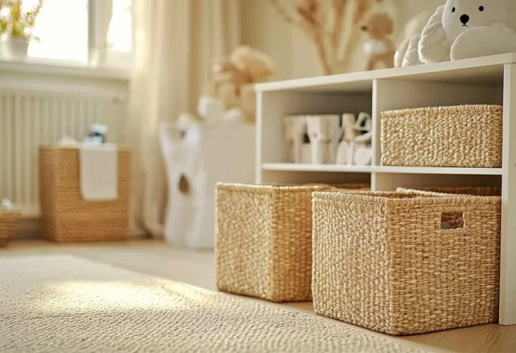 - Place storage baskets made of fabric or straw in matching shades to easily maintain order.