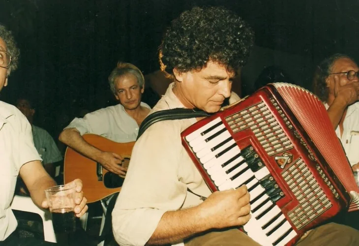 Meir Ariel, with Shalom Hanoch in the background (Photo: Courtesy of the family)Tel Aviv's bohemian community watched curiously as the kibbutz-born singer who found fame in Israel's cultural capital wrestled with a life of contradictions. From his modest apartment at the intersection of Trumpeldor and Hayarkon streets, the melancholic melodies of Meir Ariel's accordion echoed. His distinctive lyrics shaped some of the most iconic hits of the 1990s.