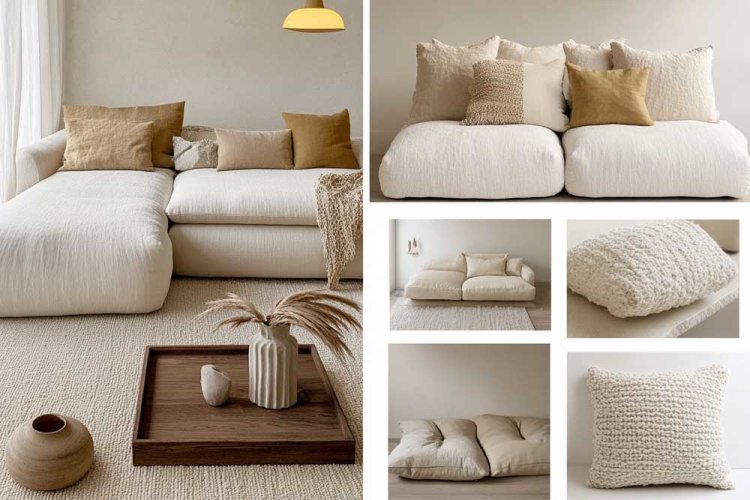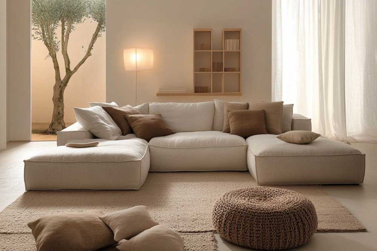 The living room in the picture is styled in neutral shades of beige and white, featuring a modular sofa, a rug with a gentle texture, and warm-hued cushions. Accessories like a small plant and a wooden tray add warmth to the minimalist style.