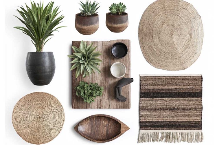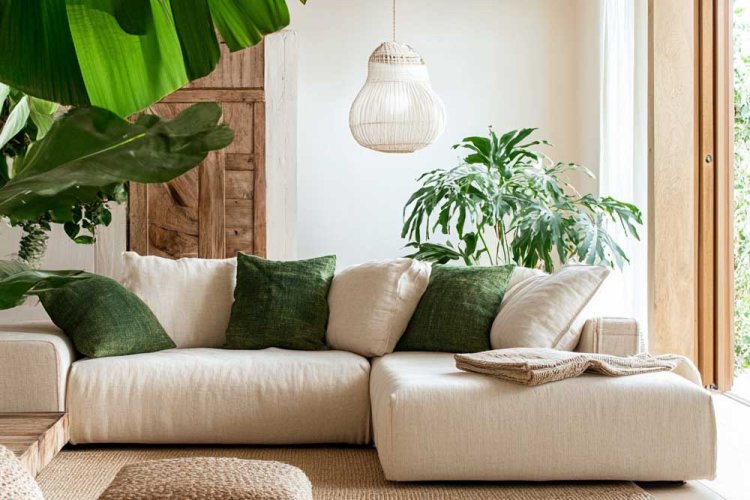 How to implement it? Use materials like reclaimed wood, natural stone, and bamboo. Add indoor plants such as large pots of monstera or ficus alongside small succulents and natural textiles like jute rugs, organic cotton cushions, and linen curtains.