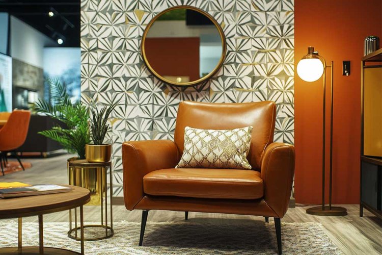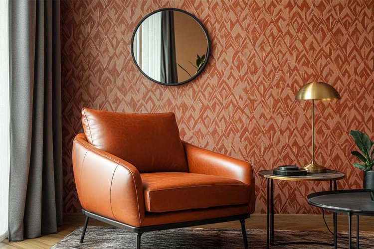 How to implement it? Use 70s-style furniture like cognac leather armchairs or coffee tables with metal legs. Add designer wallpapers with geometric patterns, alongside smart technology, like app-controlled lighting. The style combines original vintage pieces with new furniture that has a modern look. Matching accessories like gold-framed mirrors or brass lamps will blend well with emotionally valuable items like framed family photos. The living room in the picture illustrates the style accurately.